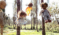 “Pero pronto encontró la solución: rodear su chinampa con muñecas, de distintos tamaños, tipos, de ojos grandes o pequeños cuerpos, todas dispuestas a protegerlo. Colocó alambre a lo largo y a las orillas de la chinampa y de ahí las colgó: del cuello, de la mano, de donde se pudiera, pero siempre vigilantes.